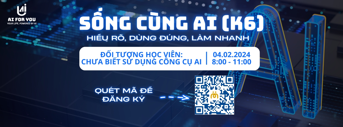Khóa học "Sống cùng AI: Hiểu rõ, Dùng đúng và Làm nhanh" được tổ chức bởi AI For You (AI4U) sẽ cung cấp cho bạn những kiến thức cơ bản, đúng đắn một cách dễ hiểu, thú vị và thực tế, song song với những kỹ năng thực hành sử dụng AI trong các phương diện khác nhau của cuộc sống hiện đại. Khóa học này do chính tôi và một số bạn có kinh nghiệm phát triển ứng dụng AI trong một số lĩnh vực khác nhau đảm nhận giảng dạy.